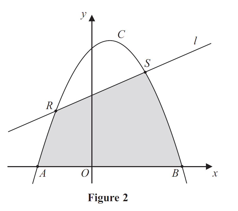 (d) Use calculus to find the area of the region bounded by $C$, the line $l$ and the $x$-axis, shown shaded in Figure 2 .